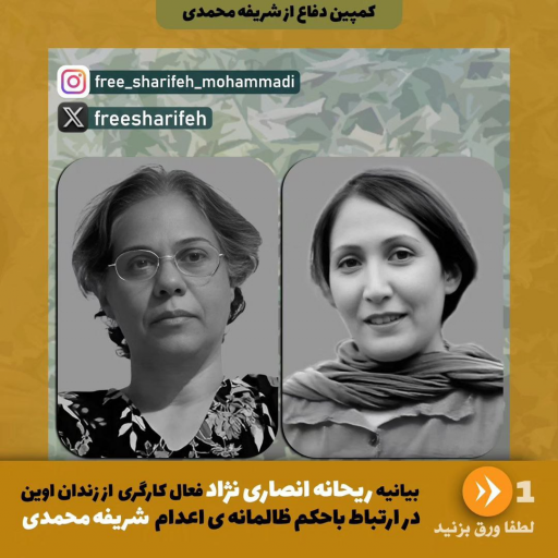 بیانیه ریحانه انصارینژاد فعال کارگری از زندان اوین در ارتباط با حکم ظالمانه ی اعدام شریفه محمدی